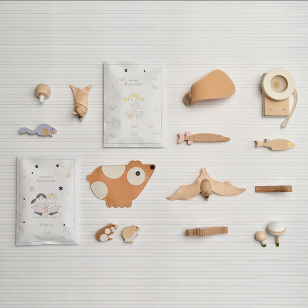 Have you ever listened to the sounds of the forest? How wind whispers through the leaves, twigs scrunch under your feet and fruits tap when they hit the ground? Shake all the fruits and listen to the unique clicking of the catkin, the deep bang of the acorn or the rustle of the alder. You can even chew the maple! The natural leather’s texture toughens with moisture, it massages the gum while helping the eruption of the first teeth.
